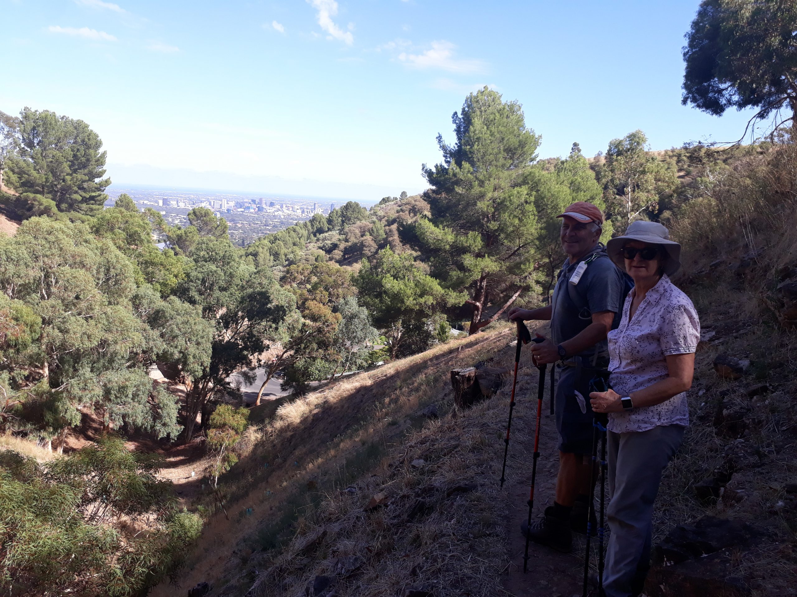 A loop walk starting from Brock Reserve with a pleasant climb up towards Mt Osmond golf course offering some splendid views back across  Adelaide to the gulf. From near the golf course we cross  Mt  Osmond Road into Themeda Reserve descending before again crossing Mt Osmond  Road prior to a zig-zag climb back into Mt Osmond Reserve for the final gentle descent back to our cars.